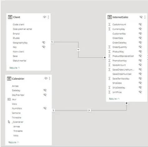 Ci-dessous nous avons notre modèle de données de base comportant la table « InternetSales » qui représente la table de faits, une table « Client », et une table « Calendrier ».