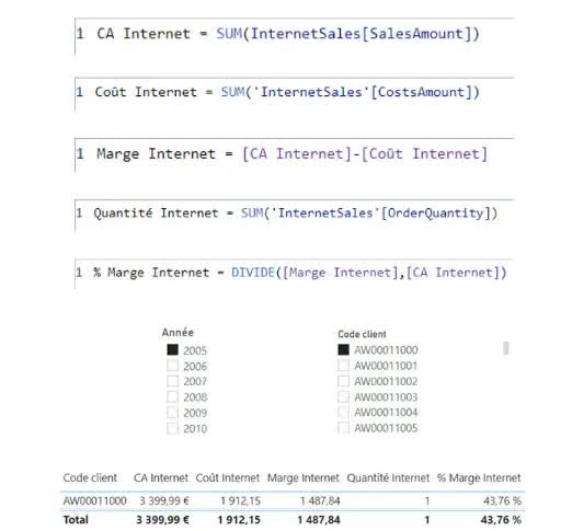 Nous avons nos mesures de base déjà créées suivant le modèle de données cité précédemment : CA Internet, Coût Internet, Marge Internet, Quantité Internet, % Marge Internet.