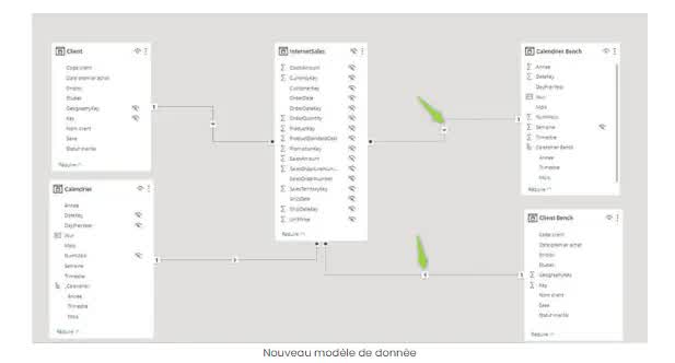 Dans notre application Power BI, nous avons des clients, leurs ventes internet ainsi qu’un calendrier. Notre Benchmarking nous permettra de comparer les ventes internet de ces clients selon la période choisie ou de comparer les ventes internet du même client avec des périodes différentes.