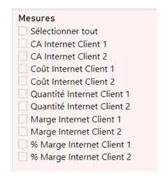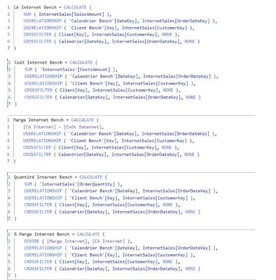 Ces nouvelles mesures sont les suivantes : CA Internet Bench, Coût Internet Bench, Marge Internet Bench, Quantité Internet Bench, % Marge Internet Bench.